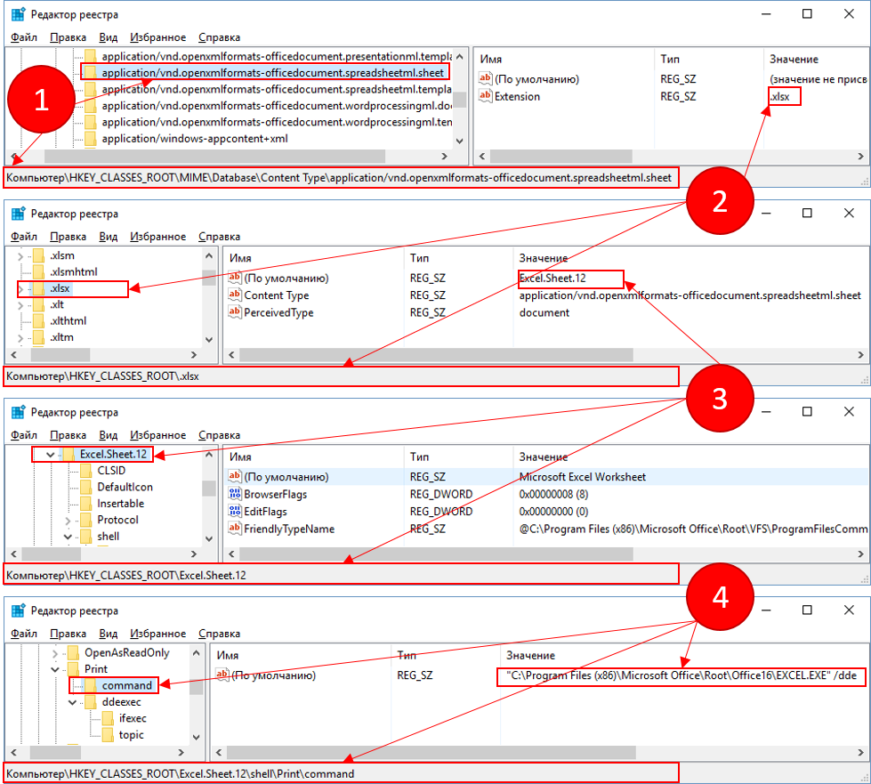- В реестре ищется раздел HKEY_CLASSES_ROOT\MIME\Database\Content Type\application/vnd.openxmlformats-officedocument.spreadsheetml.sheet для формата Excel2007 или в раздел HKEY_CLASSES_ROOT\MIME\Database\Content Type\application/vnd.ms-excel для формата ExcelXML.